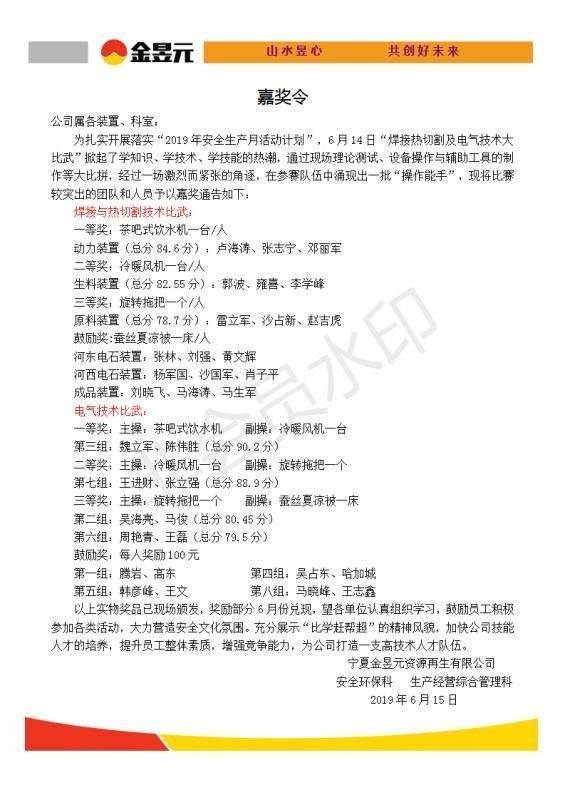 比賽結束后,公司對此次參加比賽的所有人員頒布了嘉獎令,鼓勵員工在今后的工作中提高操作水平,努力奮進,爭做優秀員工!
