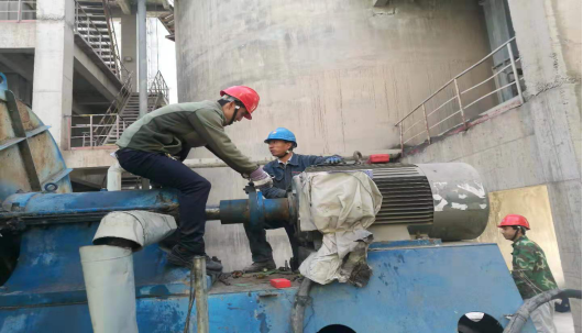 在其他設(shè)備檢維修現(xiàn)場(chǎng),工人們依然具備這種“責(zé)任心”,如生料裝置接力風(fēng)機(jī)維修現(xiàn)場(chǎng),檢維修工人通過(guò)測(cè)振儀更換“主軸”。