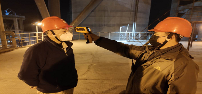 在園區南門,今日截止下午17時整,他們檢測、消毒、登記車輛92輛(其中水泥19車輛,熟料9車輛,2輛氧氣配送車),人員98人信息,體溫均在正常范圍,另外隨行26人體溫均在正常范圍。