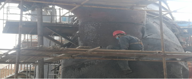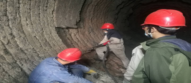 在回轉(zhuǎn)窯,做好更換窯磚前期準(zhǔn)備工作——清理深挖4米處窯皮、窯磚。