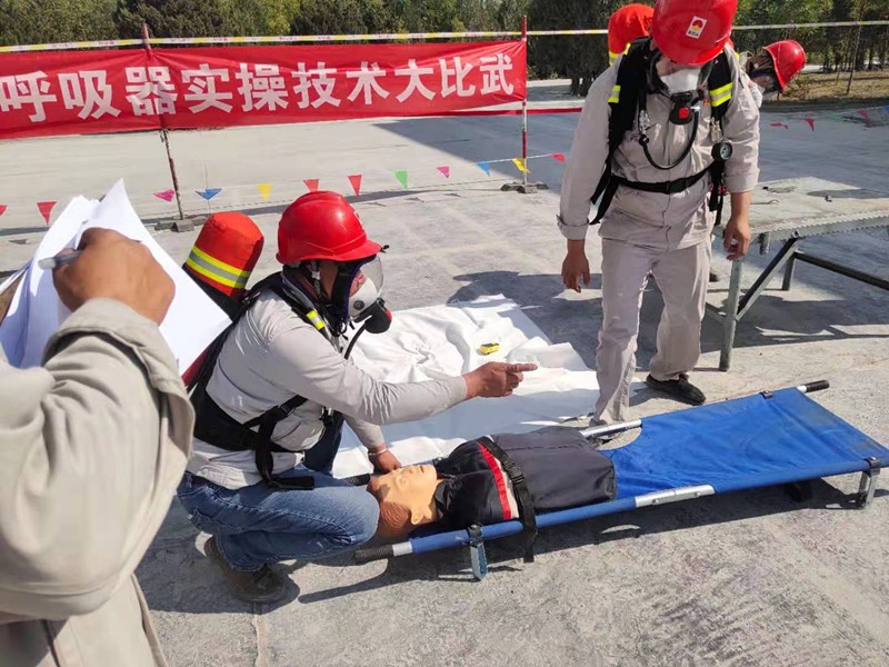 此次比賽以事故演練的方式進(jìn)行,由于2#密閉電石爐煤氣管道發(fā)生泄露,對(duì)事故泄露現(xiàn)場煤氣中毒人員進(jìn)行急救作為評(píng)比范圍。比賽開始時(shí)由參賽選手對(duì)氣瓶、呼吸器、減壓閥,面罩,背托等完好性進(jìn)行檢查。
