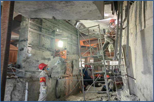 在爐壁修復現場,制作好的爐壁鐵、爐門、腳手架已被電石爐輻射熱炙烤的滾燙,檢修人員的手套阻隔不了那股熱流,他們不顧滾燙,依然堅持焊接、安裝,確保每一條焊縫安全牢靠。安全帽下每一張年輕稚嫩的臉龐,被汗水浸濕了無數遍,取下手套的手指上被汗水浸泡的發白,面對公司及裝置領導的關心,他們依然打趣的說到:“還好,不辛苦,干活五分鐘,流汗兩小時,我與烤肉的距離只差一撮孜然”。是的,在這種高溫下,我們的工人就是這么牛,這么樂觀,這么積極向上。他們拿出逢山開路,遇水架橋的闖勁,直面困難,迎難而上的干勁,百折不撓,馳而不息的韌勁,全力推動檢修工作順利完成。