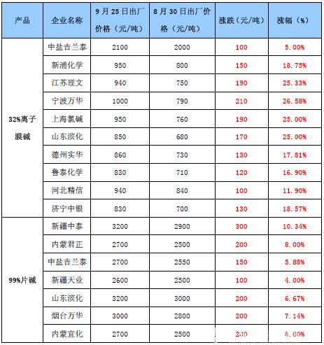 進(jìn)入9月,國內(nèi)燒堿市場終于打破7月以來的平衡狀態(tài),價格出現(xiàn)迅猛上漲走勢。截至9月25日,山東地區(qū)32%離子膜堿市場均價上漲135元/噸至800元/噸,漲幅為20.3%,內(nèi)蒙地區(qū)99%片堿上漲200元至2650元/噸,漲幅為8.16%。相比而言,片堿市場表現(xiàn)相對溫和,液堿市場則更顯迅猛。