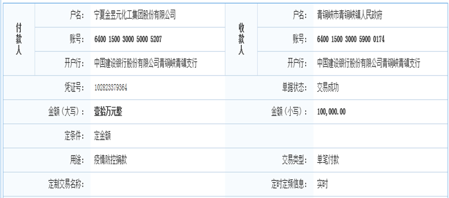 盡管新冠病毒仍在肆虐,但病毒無情,人間有愛。集團(tuán)公司履行社會(huì)職責(zé),踐行使命與擔(dān)當(dāng),2月16日,分別向邵崗鎮(zhèn)政府、青銅峽鎮(zhèn)政府捐贈(zèng)10萬元和價(jià)值1萬元物資。